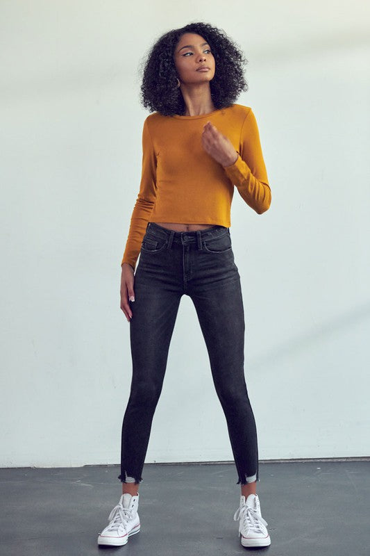 These trendy, black, slightly distressed, high rise, ankle length, skinny jeans