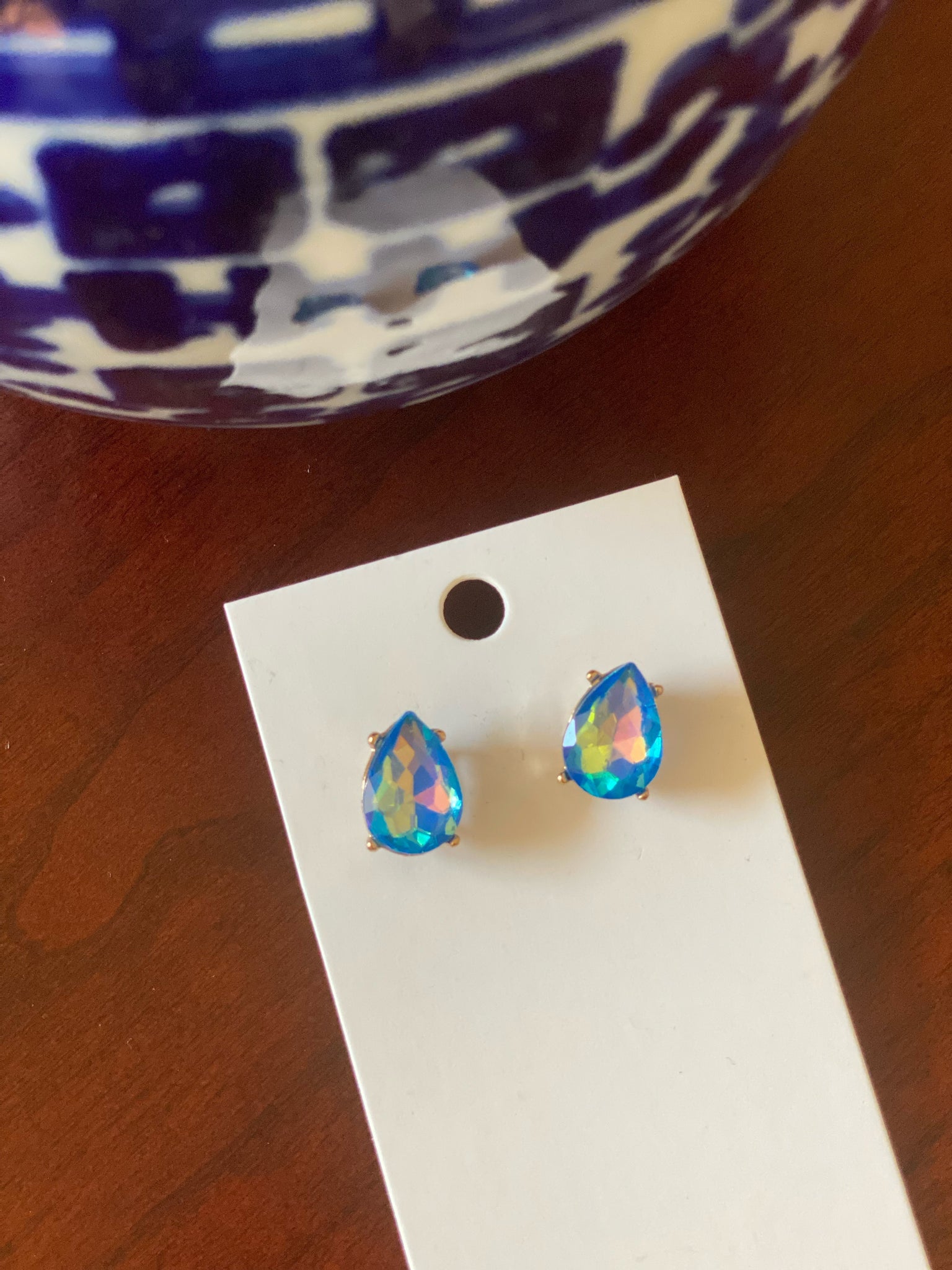 These studs are stunning! They change colors as the light hits them in different ways and are a blue/turquoise/green color. High quality and beautiful. There is a photo of them with a dime to show the size. I only have one pair of these!