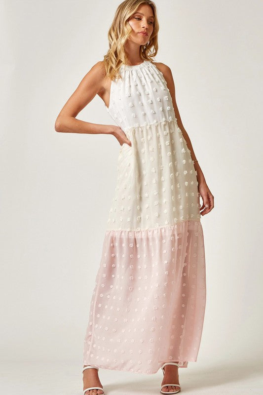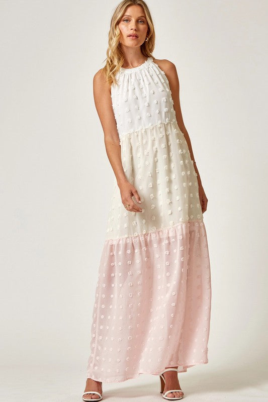 Beautiful colorblock maxi dress on our favorite pom pom fabric!