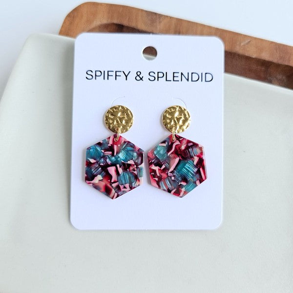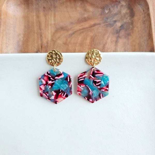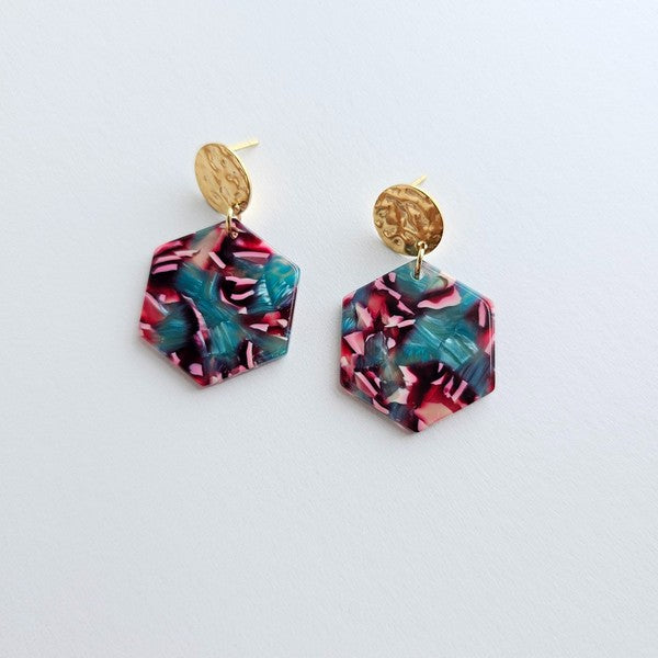 Rock your style with these eye-catching magenta and teal hexagon-shaped dangle earrings! Stylish and dainty, but still bold and daring, these earrings will help you stand out!