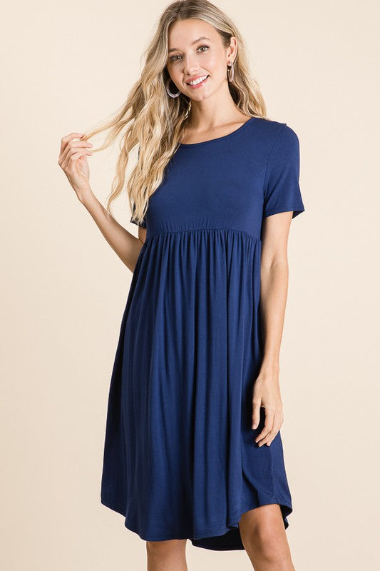 This short sleeve, navy, midi dress is super soft, comfort perfection. It can be dressed up or dressed down and worn anywhere. Perfect for teachers, work, school, moms, or anyone looking for something easy and comfortable that can also be dressed up to look great for most any occasion. The model is 5'10" and is wearing a size small.